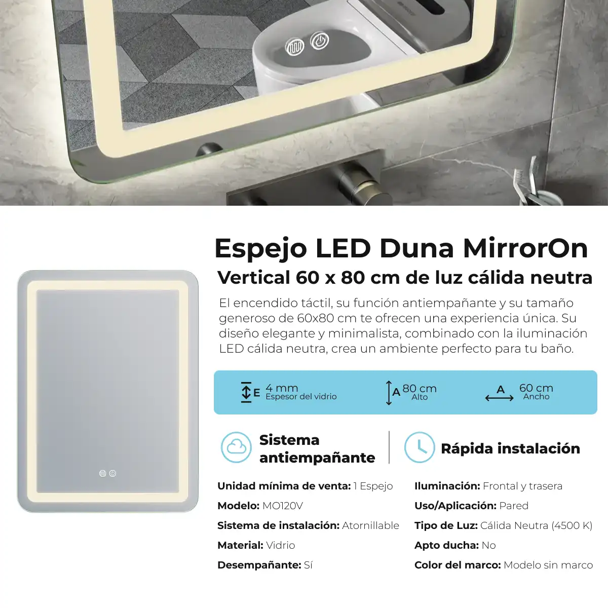 Espejo LED Rectangular Duna Vertical MirrorOn 60×80 cm Luz Cálida