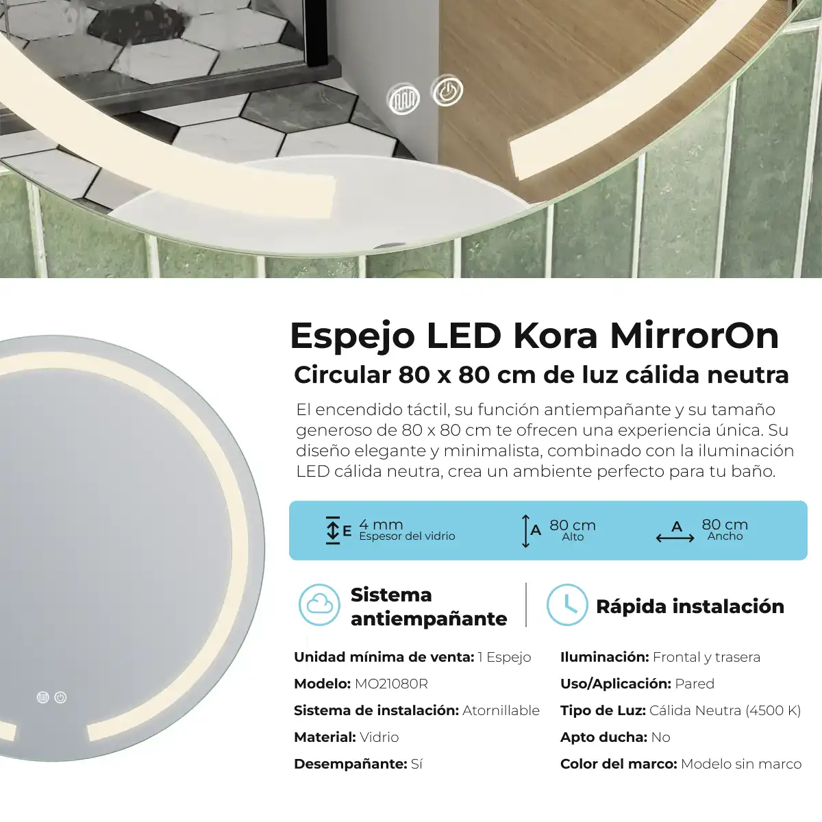 Espejo LED Circular Kora MirrorOn 80×80 cm Luz Cálida