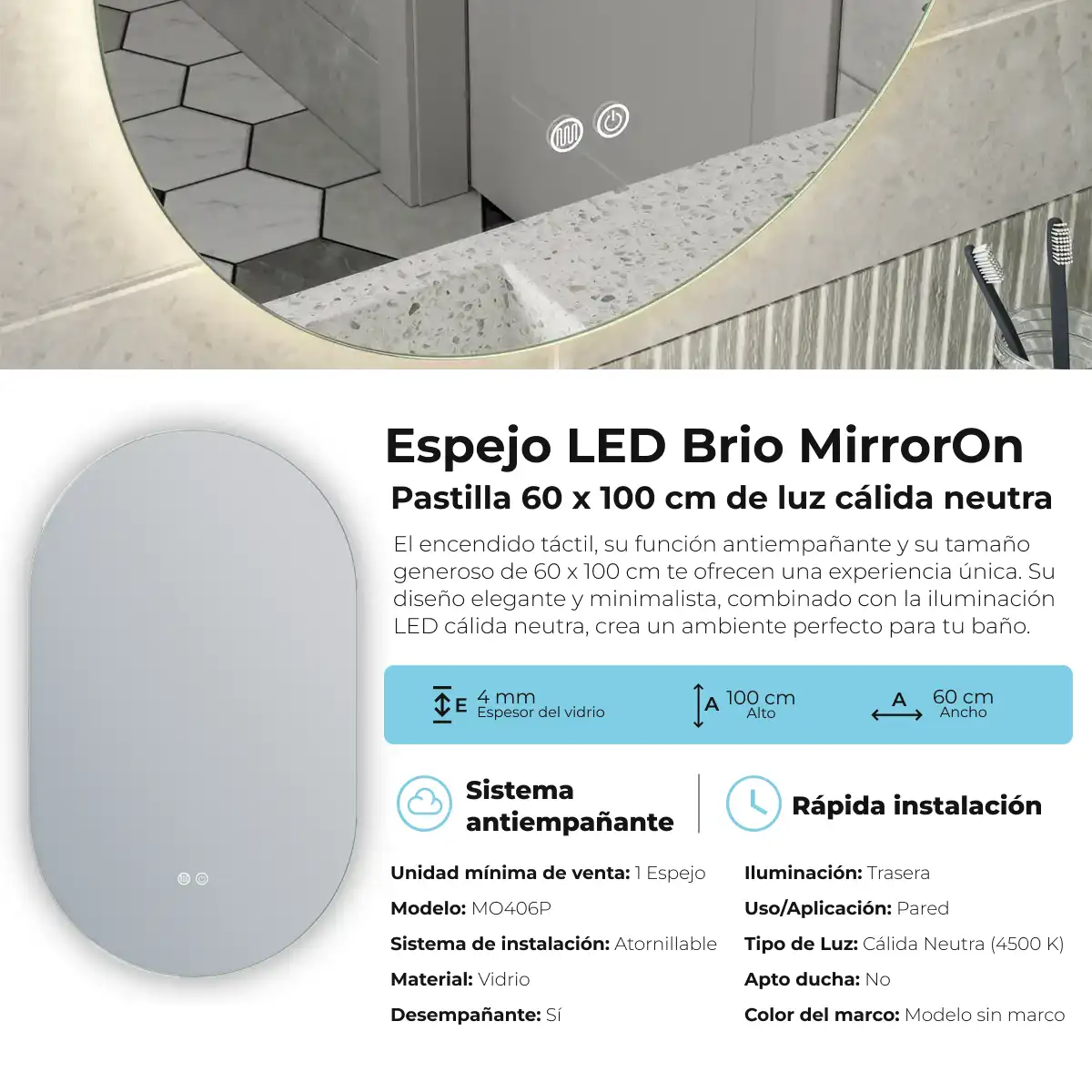 Espejo LED Rectangular Brio Pastilla Vertical MirrorOn 100×60 cm Luz Cálida