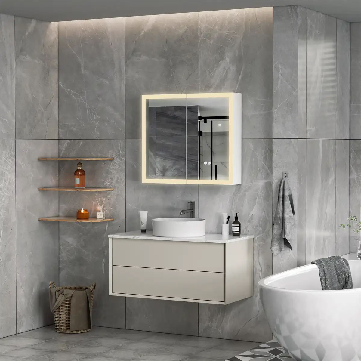 Los botiquines con espejos MirrorOn combinan iluminación LED cálida regulable de 4500K con sistema antiempañe, ideales para baños modernos.