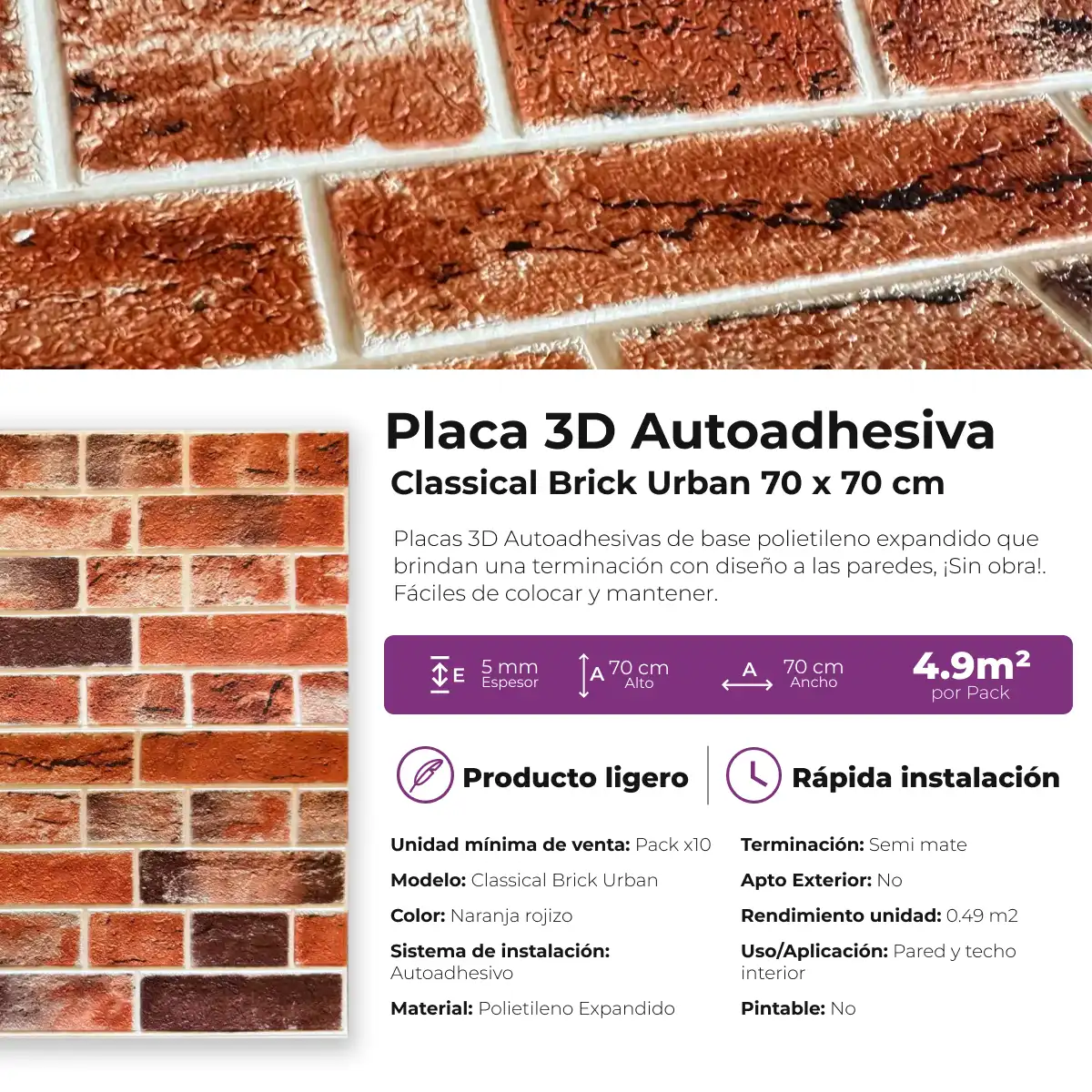 Placa 3D Autoadhesiva Classical Brick Urban Revestimiento Lifewall 70×70 cm Pack x10