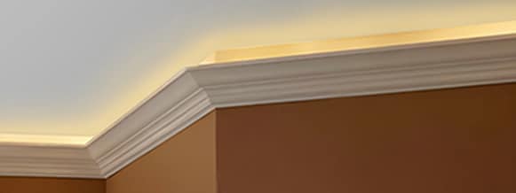 Línea de molduras en telgopor con espacio apto para colocación de LED. Posee diversos diseños modernos que garantizan una visual clara, ocultando la tira de luz a la vista.