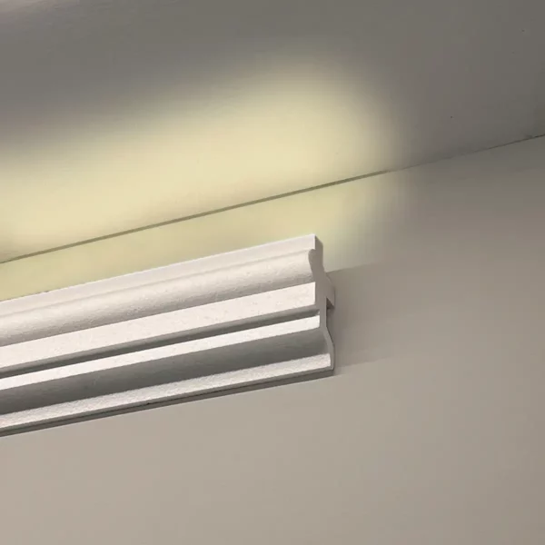 Se coloca con adhesivo para molduras o enduído. Recomendamos cortar las esquinas de empalme con un inglete para molduras y una sierra o cutter.