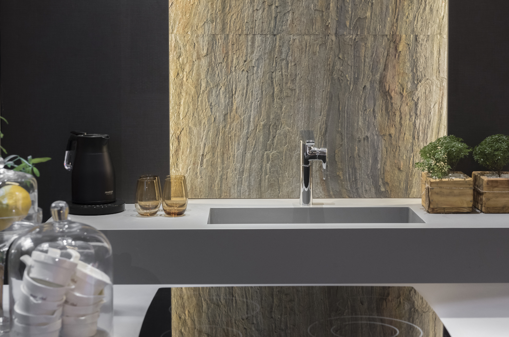 Es un revestimiento de PIEDRA REAL natural flexible. La combinación perfecta entre naturaleza y tecnología resulta en este material único que tiene la belleza y resistencia de la piedra en una lámina cubierta por una base de fibra de vidrio y resina poliéster que le dan flexibilidad, además de fuerza, al mismo tiempo que se mantiene súper liviano.