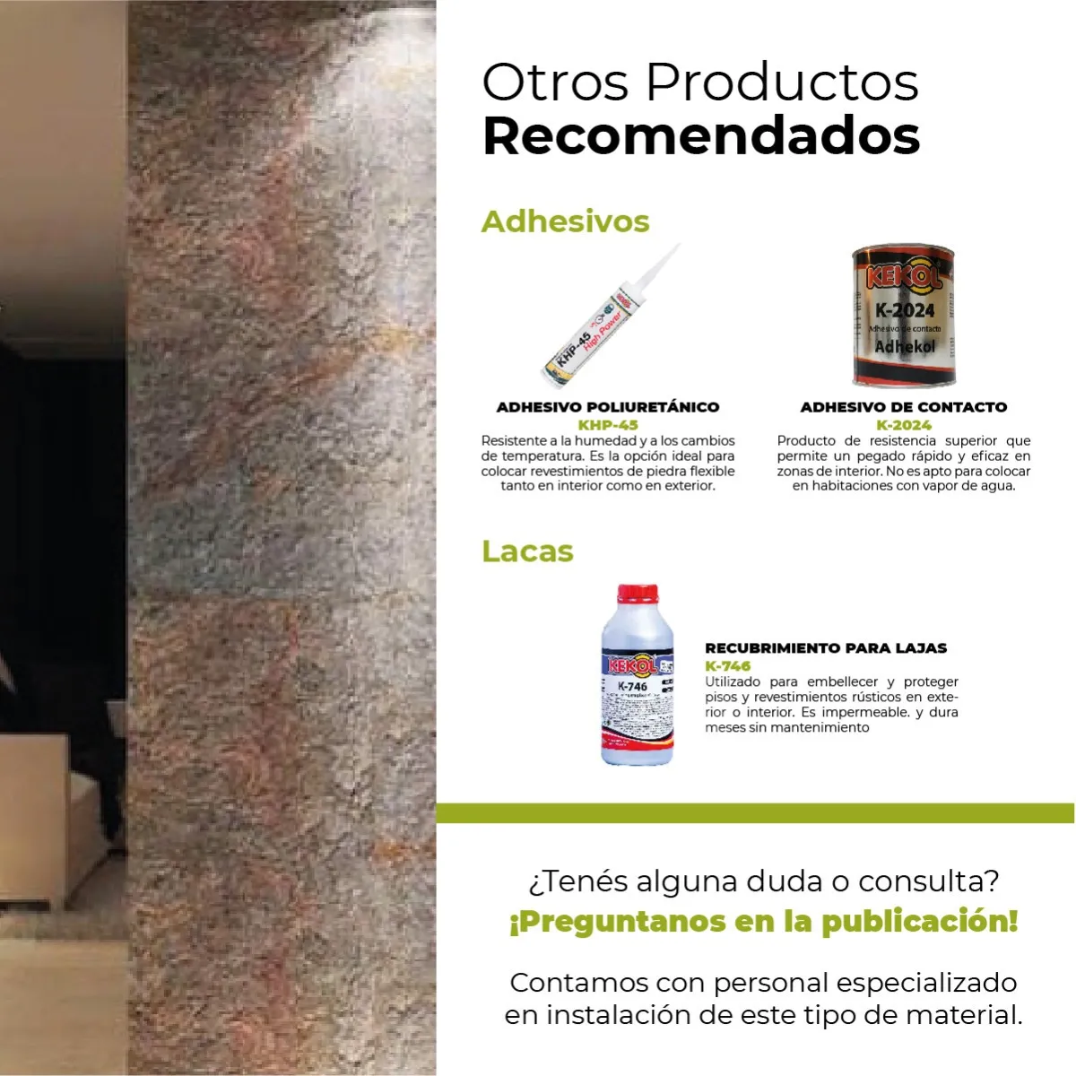 Es un revestimiento de PIEDRA REAL natural flexible. La combinación perfecta entre naturaleza y tecnología resulta en este material único que tiene la belleza y resistencia de la piedra en una lámina cubierta por una base de fibra de vidrio y resina poliéster que le dan flexibilidad, además de fuerza, al mismo tiempo que se mantiene súper liviano.