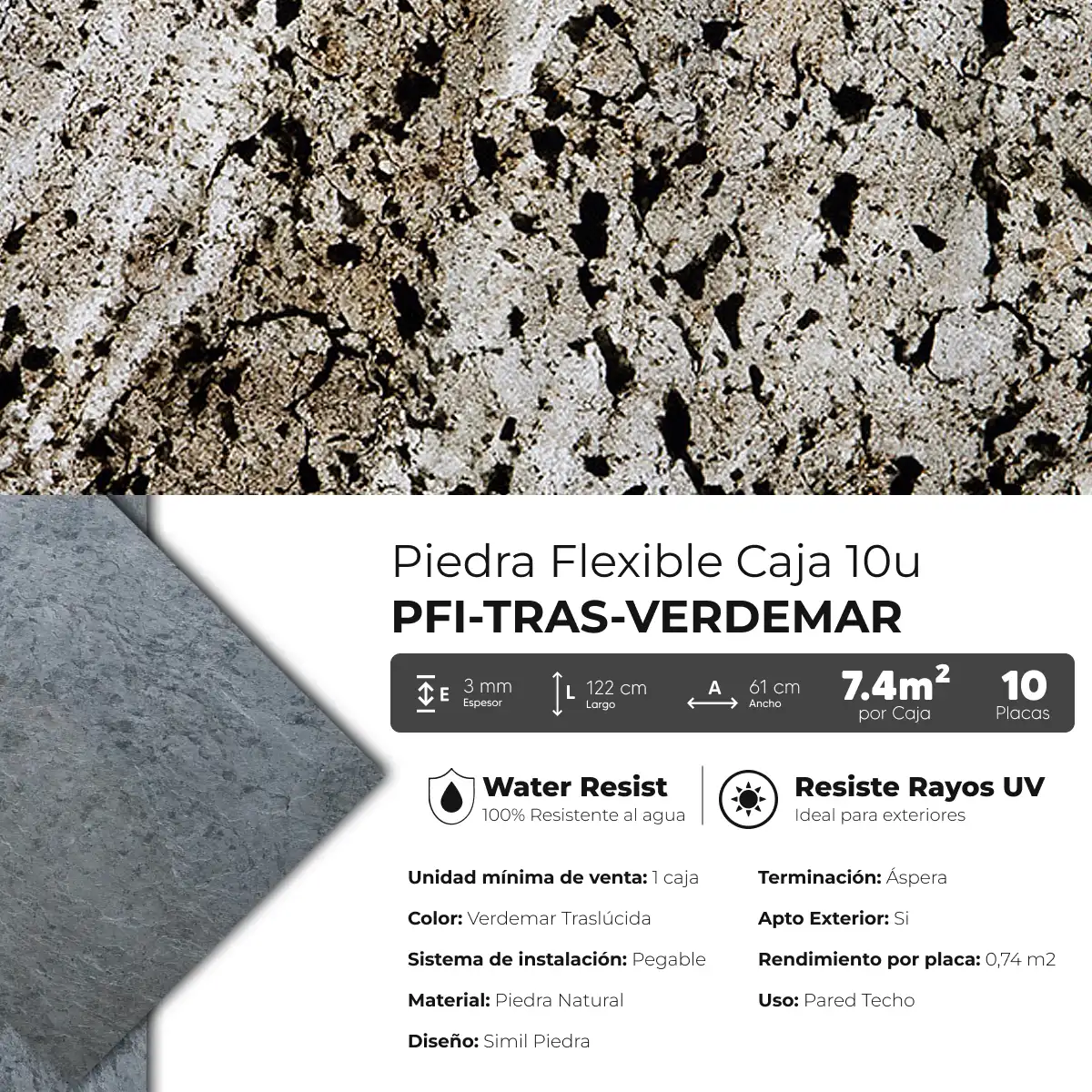 Piedra Flexible Traslúcida 61×122 cm Verde Mar Piedrafina Pack x10