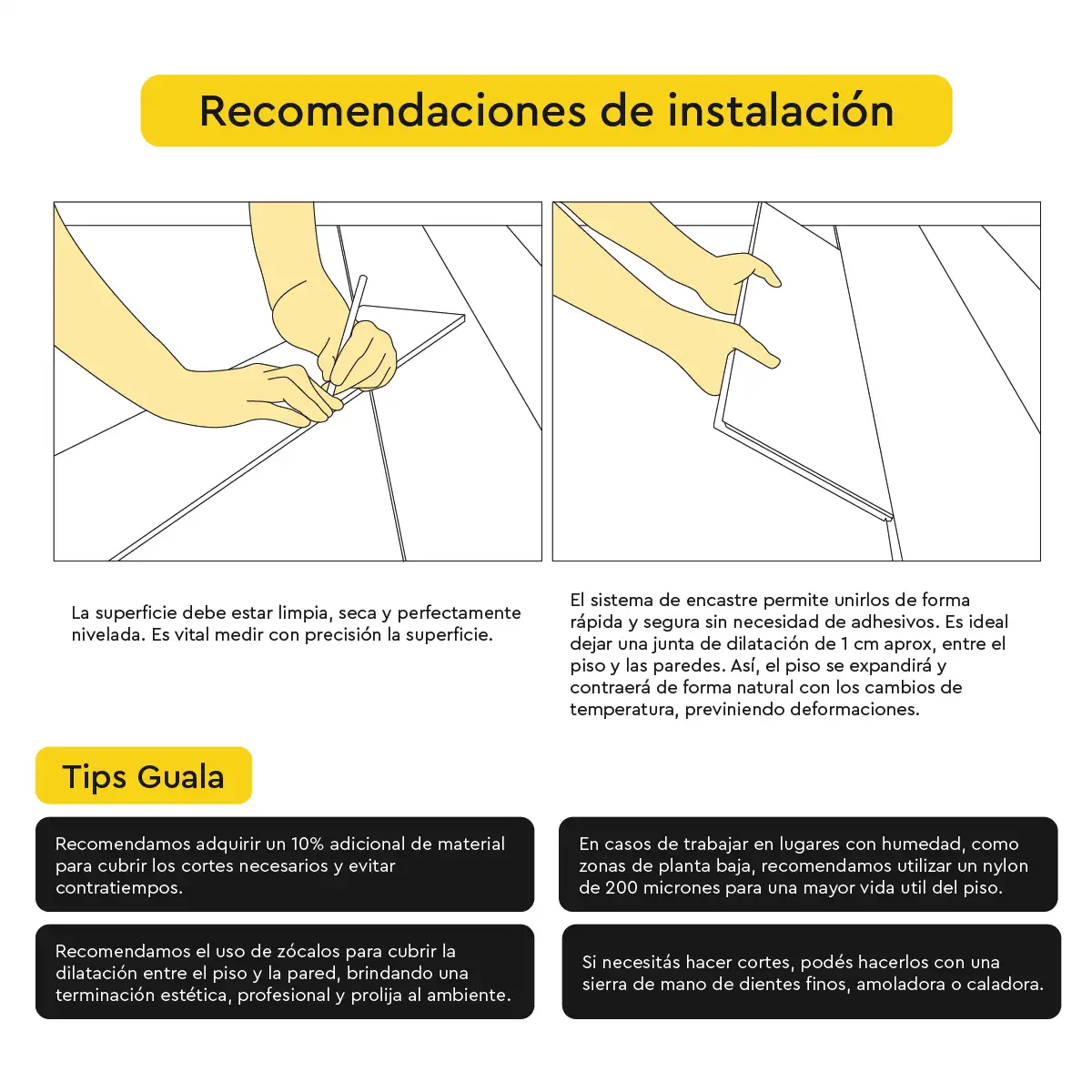 Piso flotante melaminico de alta resistencia con excelente acabado. Su sistema de encastre tipo click permite una instalación fácil y rápida.