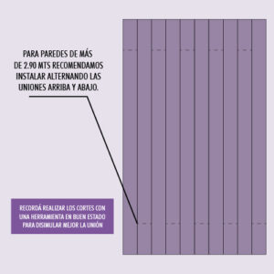 En paredes con una altura mayor a 2.90 mts, recomendamos instalar alternando las uniones arriba y abajo como se muestra en la imagen.