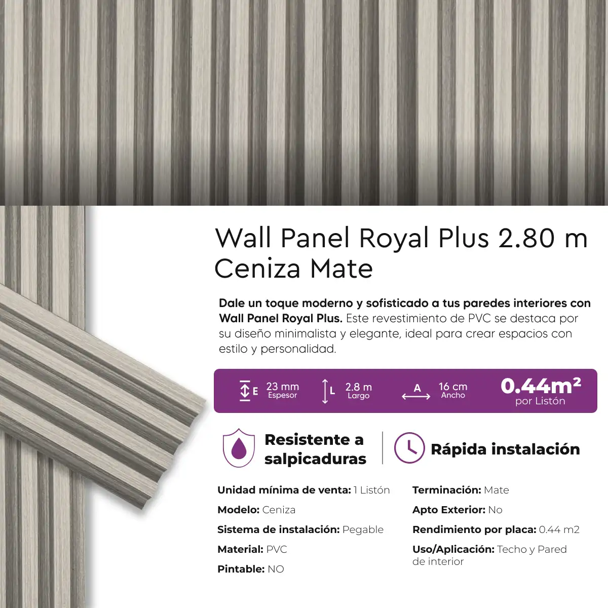 Revestimiento Wall Panel Royal Plus Ceniza Mate PVC Lifewall 2.80 m