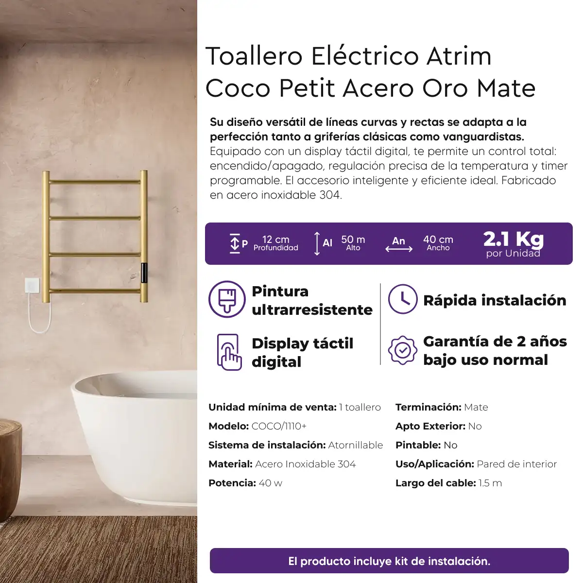 Toallero Eléctrico Atrim Petit Coco 50×40 cm Acero Oro Mate
