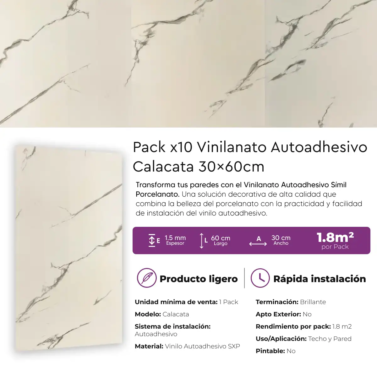 Vinilanato Autoadhesivo Decorativo 30×60 Calacata Pack x 10 Lifewall 1.8 m²