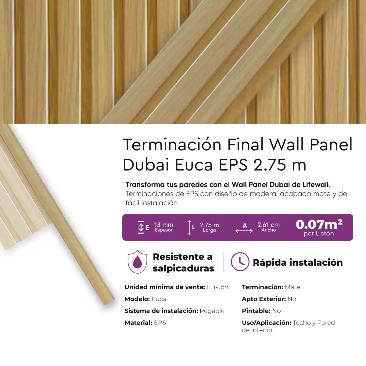 Cada terminación de 2.75 metros de largo, ofrece un elegante acabado mate y textura lisa, instalándose fácilmente con adhesivos para EPS. Elige entre 3 diseños realistas de madera, con la garantía de un acabado profesional. Ideal para renovar tus paredes de forma rápida y sencilla, el Wall Panel Dubai te permite disfrutar de la estética de la madera con la ligereza y versatilidad del EPS.