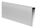 Zócalo de acero inoxidable de diseño recto y vista cuadrada, provisto de un listón de madera que se sujeta a la pared y sobre el cuál se instala el perfil.