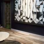 Zócalo de acero inoxidable de diseño recto de vista cuadrada, provisto de un listón de madera que se sujeta a la pared y sobre el cuál se instala el perfil.